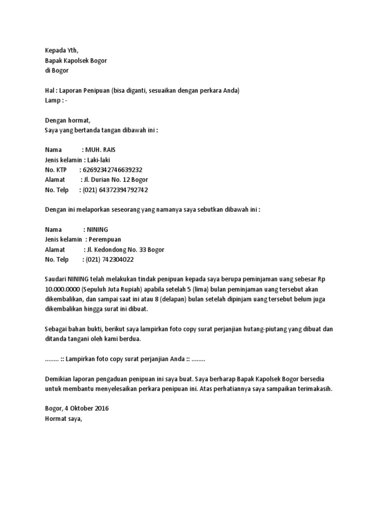 Contoh surat kronologis kejadian penipuan. Contoh surat pernyataan tidak sedang bekerja. Surat pernyataan merupakan surat yang berisi penegasan bahwa seseorang pernah atau tidak pernah melakukan sesuatu yang tertera dalam surat tersebut. Padahal, surat pernyataan merupakan salah satu hal yang esensial dan ditulis di atas meterai. Namun sebelumnya, tahukah anda apa itu surat pernyataan? Untuk lebih jelasnya sebaiknya perhatikan contoh dari surat pernyataan dari beberapa fungsi. Itulah contoh surat pernyataan kesanggunpan yang bisa kamu jadikan acuan untuk membuat pernyataan yang semisal. Seperti apa contoh surat pernyataan yang benar? Surat pernyataan adalah surat yang dibuat oleh seseorang yang berisi pernyataan yang terkait dengan dirinya atau perlakunya. Surat pernyataan biasanya dibuat oleh orang yang ingin menerangkan sesuatu agar bisa dipercaya oleh penerima surat. Pada bagian bawah dari surat pernyataan ini juga terdapat tanda tangan lurah setempat. Seperti biasanya, setiap surat pernyataan harus disertai dengan materai 6000, supaya lebih sah secara hukum. Dengan surat ini, kita dapat mengikat seseorang untuk keperluan sesuai dengan kasus atau pernyataan yang ingin di lakukan.